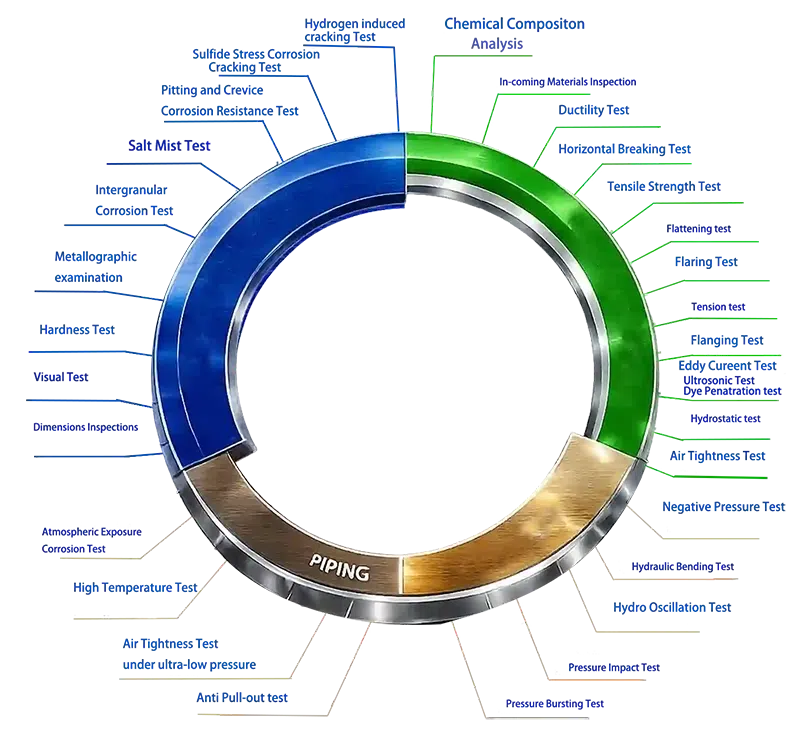 Dimensional inspection and visual inspection are performed to verify compliance with dimensional standards such as ASME B36.10, ASME B36.19, ASME B16.5 and EN standards. Dimensional inspection includes outside diameter, wall thickness, length, straightness, ovality, flange dimensions and fitting dimensions.